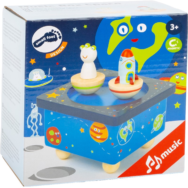 Jolie boite à musique en bois colorée sur le thème de l'espace.