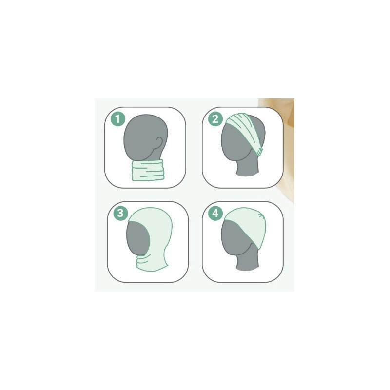 Il est fabriqué en laine à maille fine et soie et peut être utilisé comme foulard, bandeau, bonnet ou cagoule.