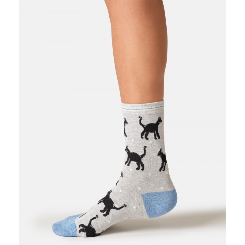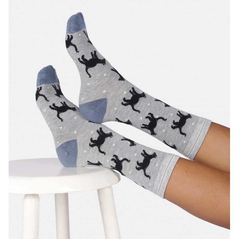 Chaussettes grises avec motifs chats noirs.