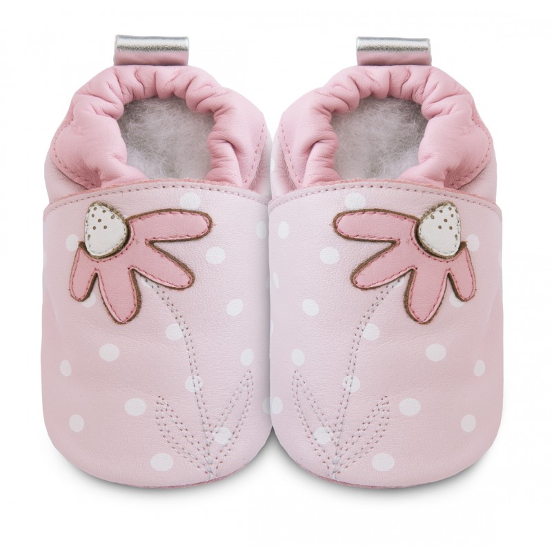 L'effet pied nu de ces petits chaussons est parfait pour les premiers pas de bébé. En plus de leur qualité premium, les chaussons souples en cuir sont tendances ! La couleur rose est destinée à nos petites princesses. La fleur et les pois sont des motifs de saisons. Modèle de chaussons 100% girly !