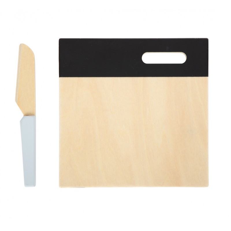 Il comprend une planche à découper et un couteau en bois ainsi qu'un emballage réutilisable qui peut servir de caisse de rangement.