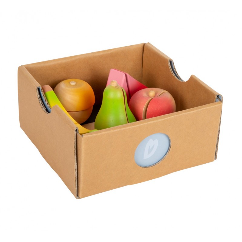 Ce set de fruits à découper en bois robuste permet de jouer dans la cuisine des enfants de manière particulièrement réaliste.