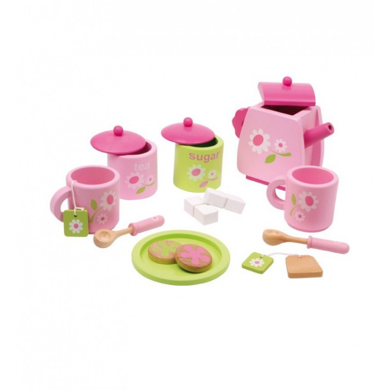 Cet ensemble en bois vernis comprend : 2 tasses avec couvercle, théière, sucrier, pot, 2 cuillères, 2 sachets de thé et 2 morceaux de sucre ainsi qu'une assiette et 2 biscuits.
