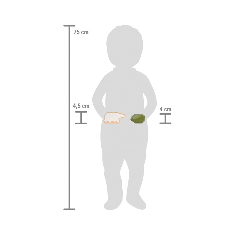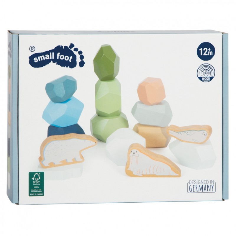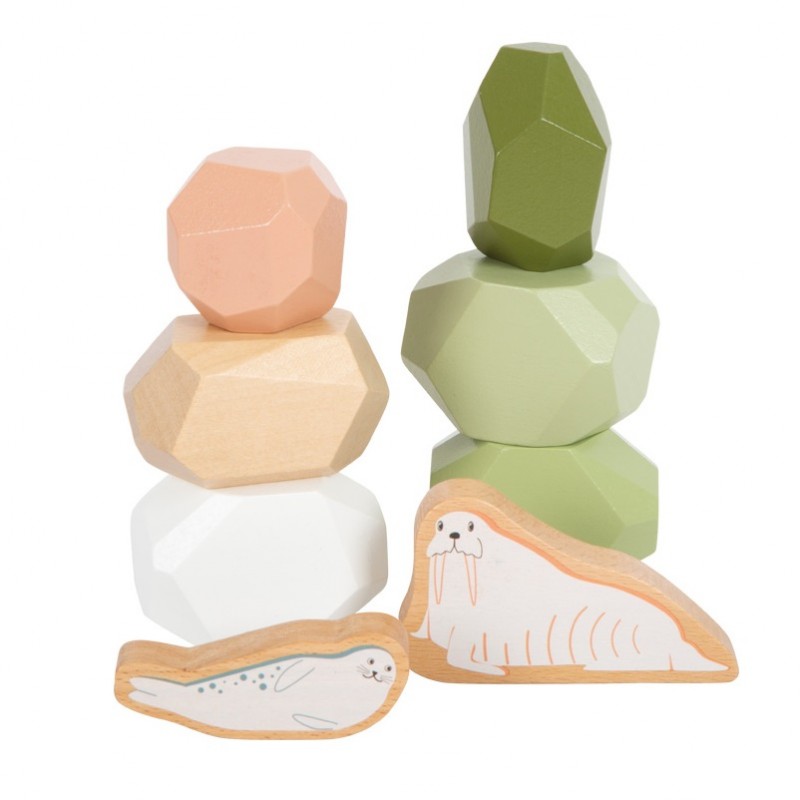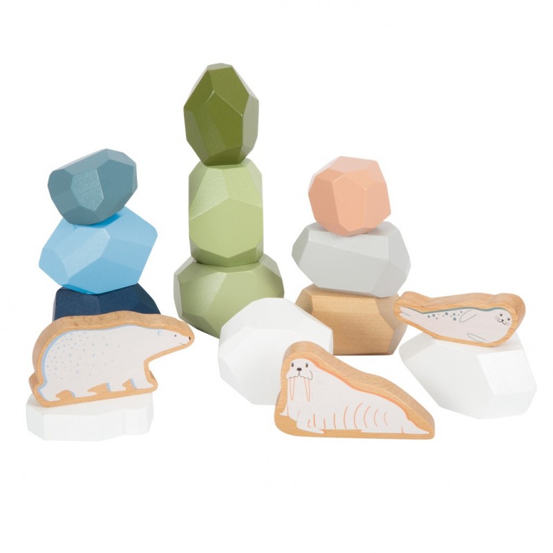 Trois animaux en forme de phoque, d'ours polaire et de morse ainsi qu'une pierre en forme de banquise permettent, avec les pierres d'équilibre de différentes couleurs, de créer des paysages arctiques et incitent à raconter des histoires en faisant preuve d'imagination.