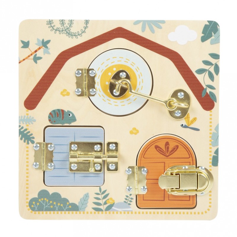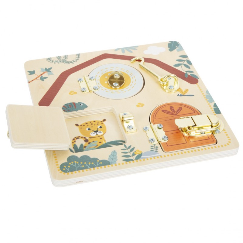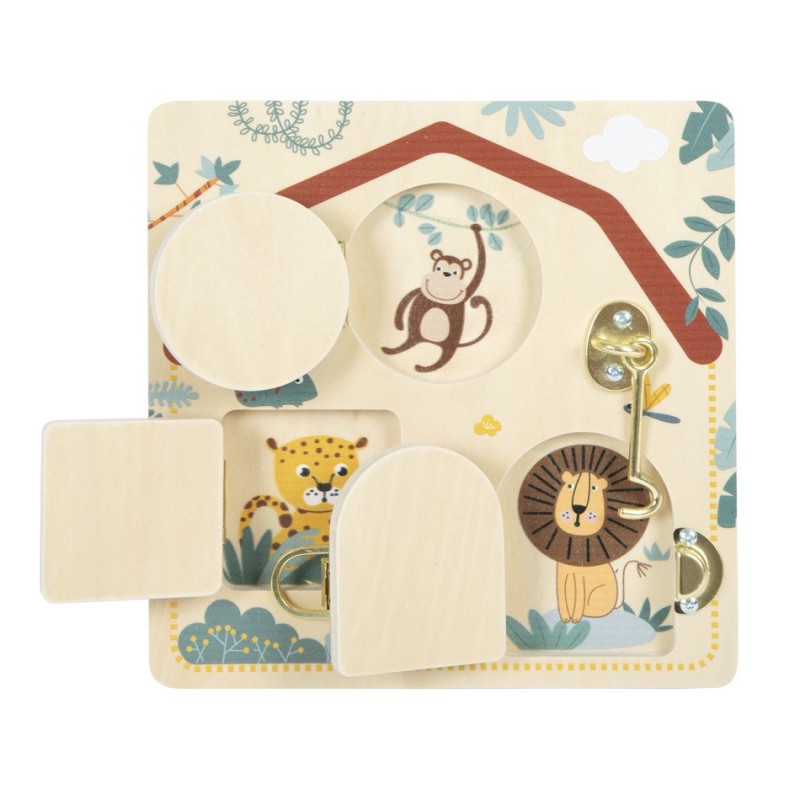 La planche d'apprentissage au look exotique « safari » dispose de deux fenêtres et d'une porte dotées de différentes fermetures qui laissent entrevoir d'adorables animaux.