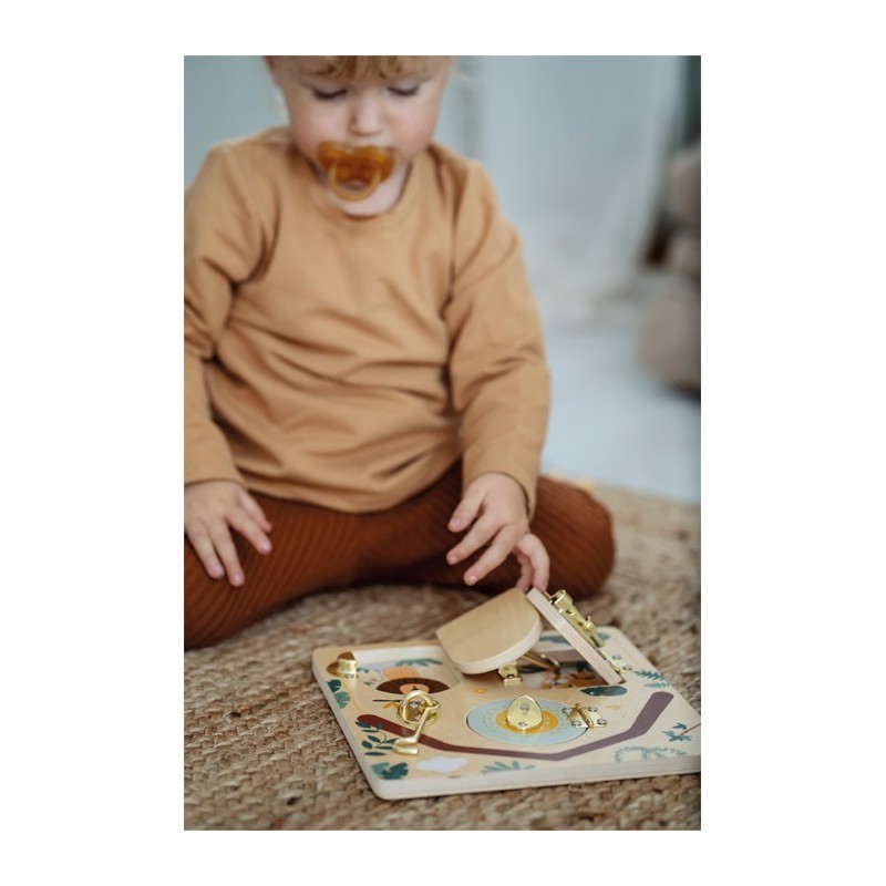 Fermer, ouvrir, découvrir ! Cette planche de motricité en bois, conçue avec amour, offre aux jeunes enfants de multiples possibilités de jeu et d'apprentissage.