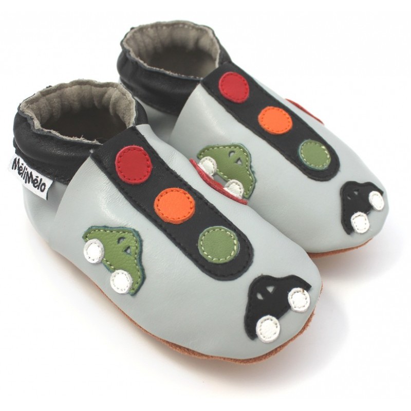Chaussons en cuir souple voiture et feux tricolores pour tous nos petits pilotes.