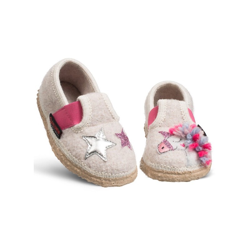 Superbes chaussons Beiges avec motifs étoiles argentées et licorne.