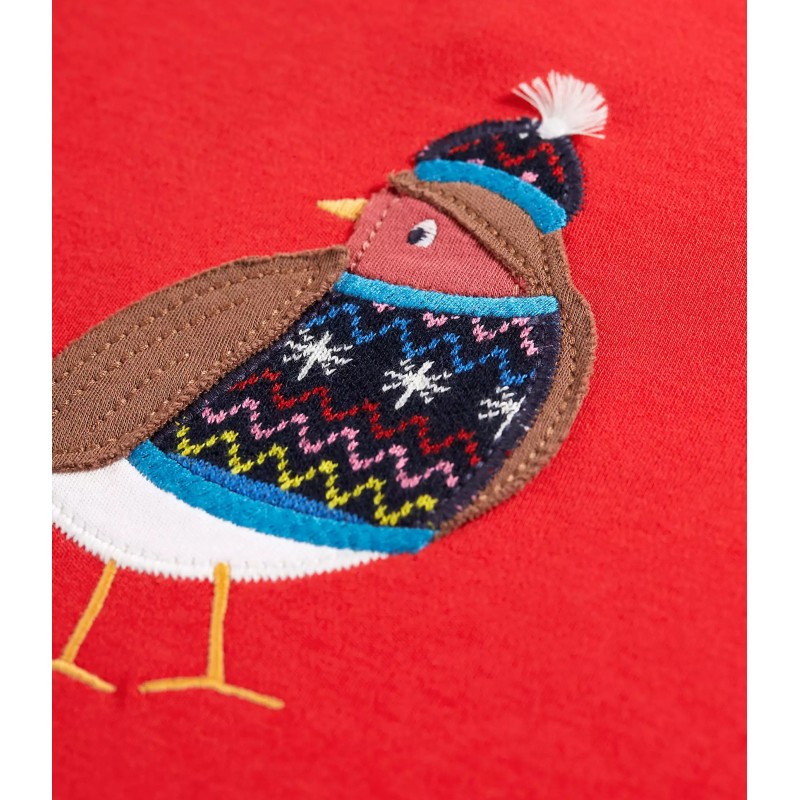 Un adorable petit oiseau emmitouflé dans sa tenue d'hiver à élu domicile sur le devant de ce joli haut rouge.